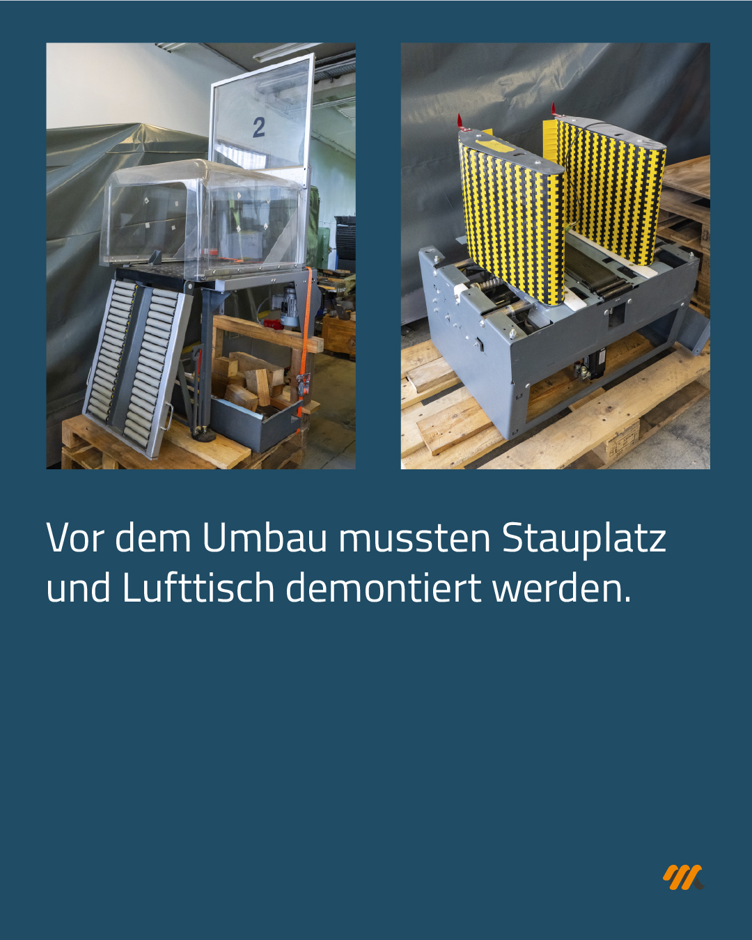 Für diesen Prozess wurden die Maschinen auf speziell für sie gefertigte Gestelle montiert. Bevor der eigentliche Umbau beginnen konnte, mussten zunächst die Stauplätze und Lufttische entfernt werden, welche später ebenfalls von Rechts- auf Linksbetrieb umgebaut wurden. Danach ging es an die Kabelverlegung: Alle Verbindungen wurden abgeklemmt und teilweise neu verkabelt. Anschließend wurde die Schaltschränke auf ihre neue Position umgesetzt.